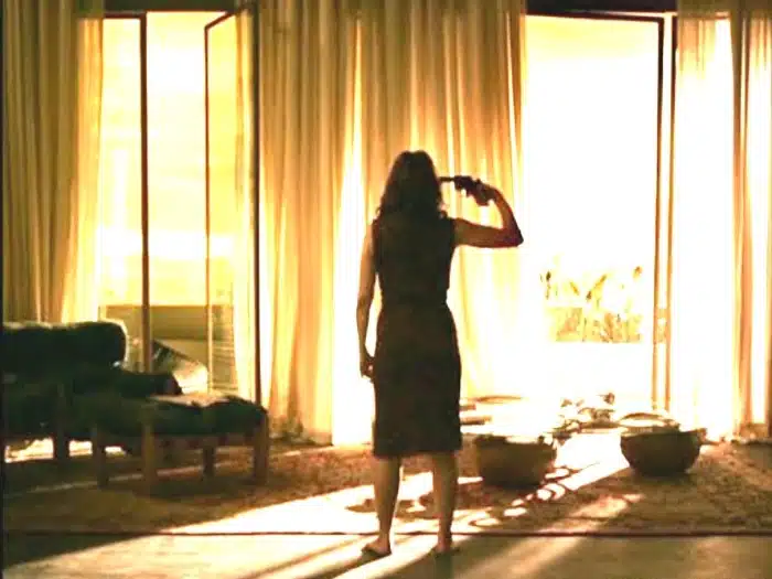 Com um revólver em punho ela atira contra um vaso de cristal e pede explicações, na mira da arma, a filha e o marido tentam explicar o inexplicável. Inconformada ela aponta contra Alex, mas é impedida pela filha quando entra na frente para protegê-lo.